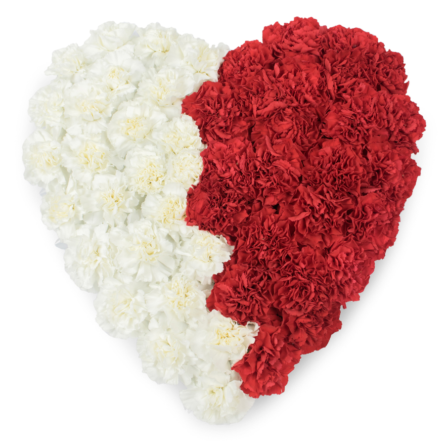 Our sophisticated heart-shaped arrangement features a delightful mix of white and red carnations, perfect for expressing heartfelt sympathy and love.