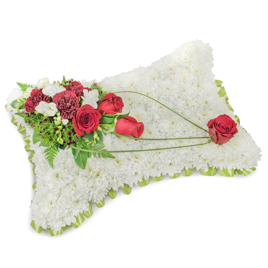 Offer your heartfelt sympathies with our refined sympathy bouquet, featuring a sophisticated selection of white chrysanthemums, red roses, white freesias, dark red carnations, dianthus, and bear grass. Each flower is hand-picked to ensure top-tier freshness and quality.