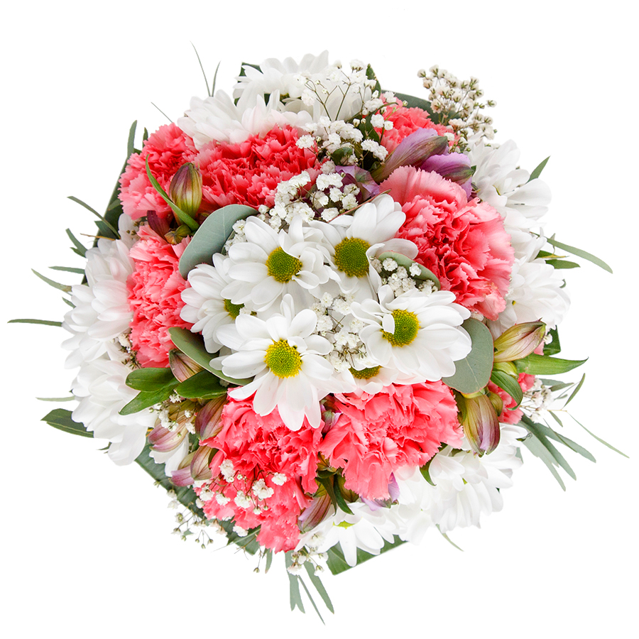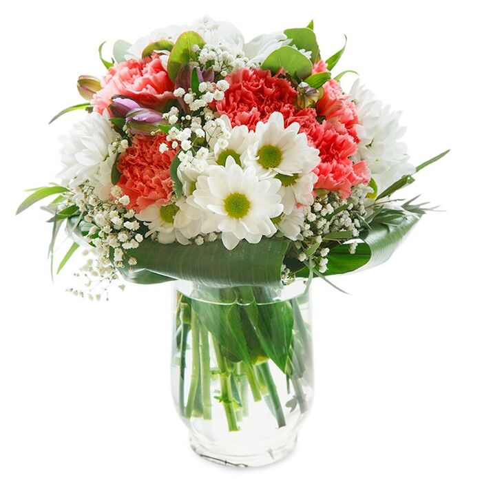Delight someone special with this beautifully unique flower arrangement. Our bouquet features a harmonious blend of snow-white chrysanthemums and delicate gypsophila, complemented by light pink carnations elegantly wrapped in aspidistra leaves. Each flower is hand-selected to ensure the highest quality and freshness.